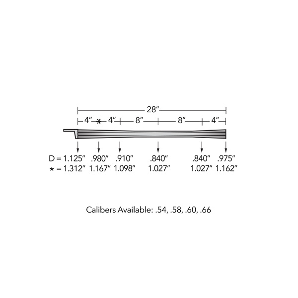 | Size | D .54 caliber – 1.66” Square Rifling with Flared Plug, D .54 caliber – 1.66” Radius Rifling with Flared Plug, D .58 caliber – 1.66” Square Rifling with Flared Plug, D .58 caliber – 1.66” Radius Rifling with Flared Plug, D .60 caliber – 1.66” Square Rifling with Flared Plug, * .66 caliber – 1.56” Radius Rifling with Flared Plug, * .66 caliber – 1.66” Radius Rifling with Flared Plug |